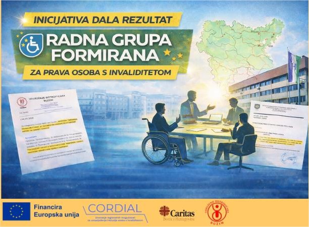 Inicijativa Udruženja distrofičara Bužim za pokretanje procesa izrade Lokalnog akcionog plana u oblasti invalidnosti za Unsko-sanski kanton dobila je konkretan rezultat. Ministarstvo zdravstva, rada i socijalne politike USK prepoznalo je značaj uključivanja organizacija osoba s invaliditetom u ovaj proces, te je na prijedlog Ministarstva Mreža organizacija osoba s invaliditetom USK imenovala Samira Đulića za svog predstavnika u radnu grupu za izradu kantonalnog plana implementacije Strategije za unapređenje prava i položaja osoba s invaliditetom u Federaciji BiH 2025–2030. Formiranjem radne grupe napravljen je važan korak ka tome da osobe s invaliditetom i njihove organizacije budu direktno uključene u kreiranje mjera, aktivnosti i politika koje utiču na njihov svakodnevni život. Očekujemo da budući plan donese konkretna rješenja u oblastima pristupačnosti, socijalne zaštite, zdravstva, obrazovanja, zapošljavanja i ravnopravnog učešća osoba s invaliditetom u društvu. Zahvaljujemo Ministarstvu zdravstva, rada i socijalne politike USK na otvorenosti za saradnju i prepoznavanju značaja aktivnog učešća organizacija osoba s invaliditetom u procesima donošenja odluka. Aktivnosti se realizuju u okviru projekta „Probudi – Pokreni – Promijeni“, koji provodi Udruženje distrofičara Bužim u partnerstvu sa Udruženjem amputiraca Bužim, u sklopu projekta CORDIAL (Creating Opportunities Regionally for Disability Inclusion Action and Legislation), koji provodi Caritas Bosne i Hercegovine, a finansira Evropska unija. Izvor: Mreža za izgradnju mira Navigacija objava SINDIKAT PROSVJETE NE SMIJE SARAĐIVATI SA ONIMA KOJI NEGIRAJU ZLOČINE Muzej moderne umjetnosti Sveučilišta u Mostaru otvara stalni postav